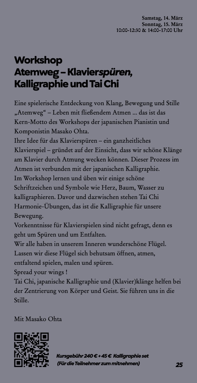 "Atemweg" – Leben mit fließendem Atmen ... das ist das Kern-Motto des Workshops der japanischen Pianistin und Komponistin Masako Ohta.