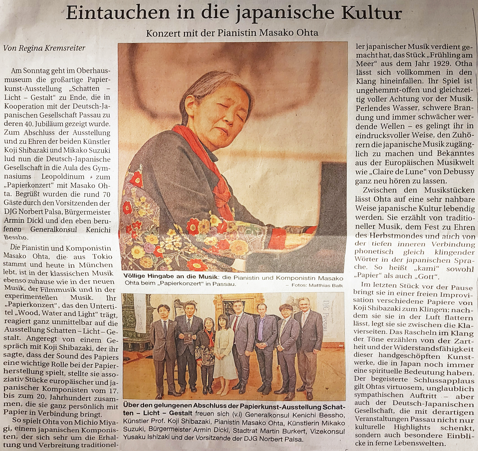 Rezension über das "Papier-Konzert" zum 40. Jubiläum der Deutschen Japanischen Gesellschaft Passau in der Zeitung: "Passauer Neue Presse" (24.10.2023)